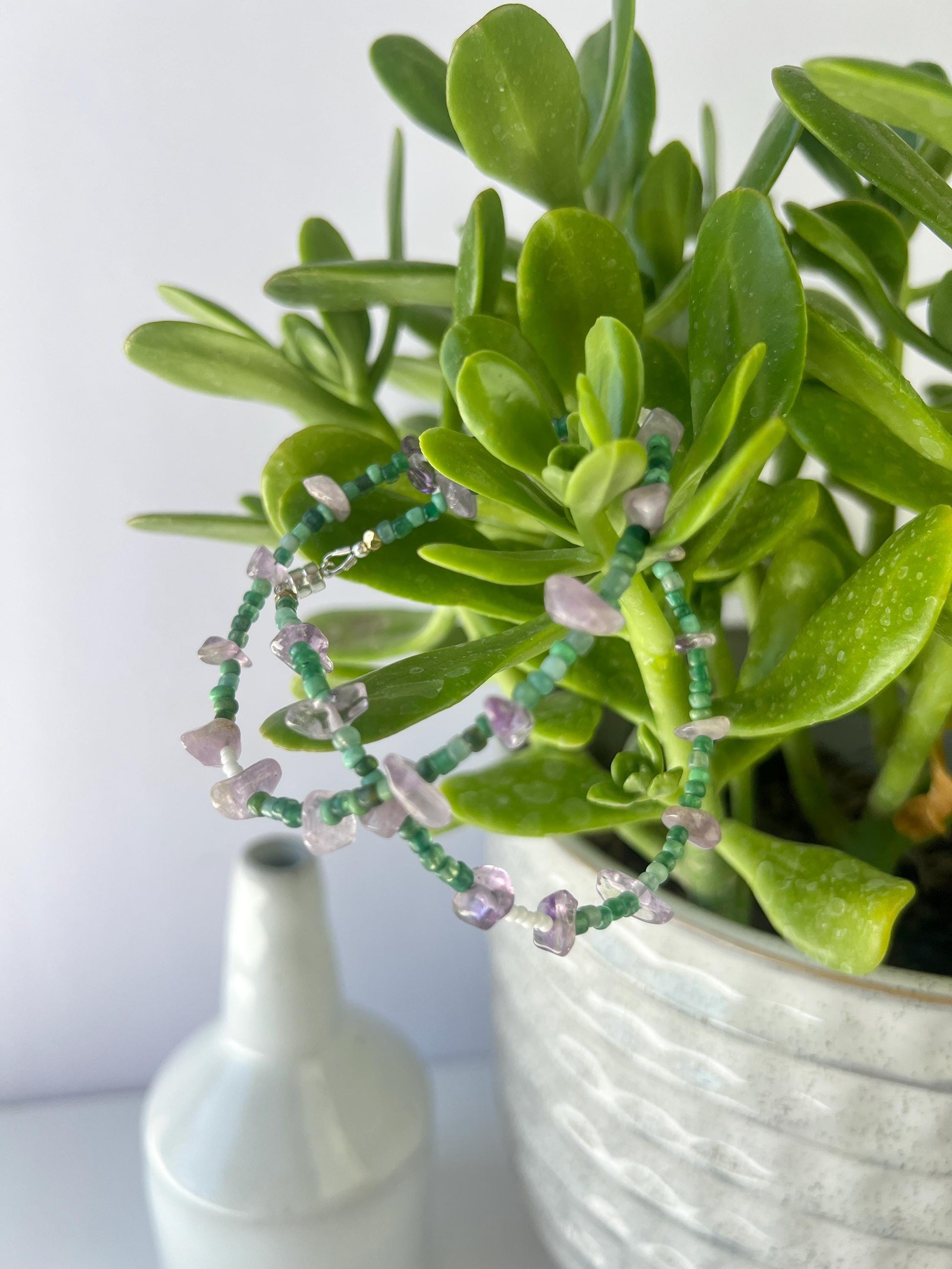 This eclectic boho necklace features a variety of amethyst chip gemstones with small green and white seed beads strung in between. It measures approximately 16 inches in length and is finished with a sterling silver magnetic clasp.