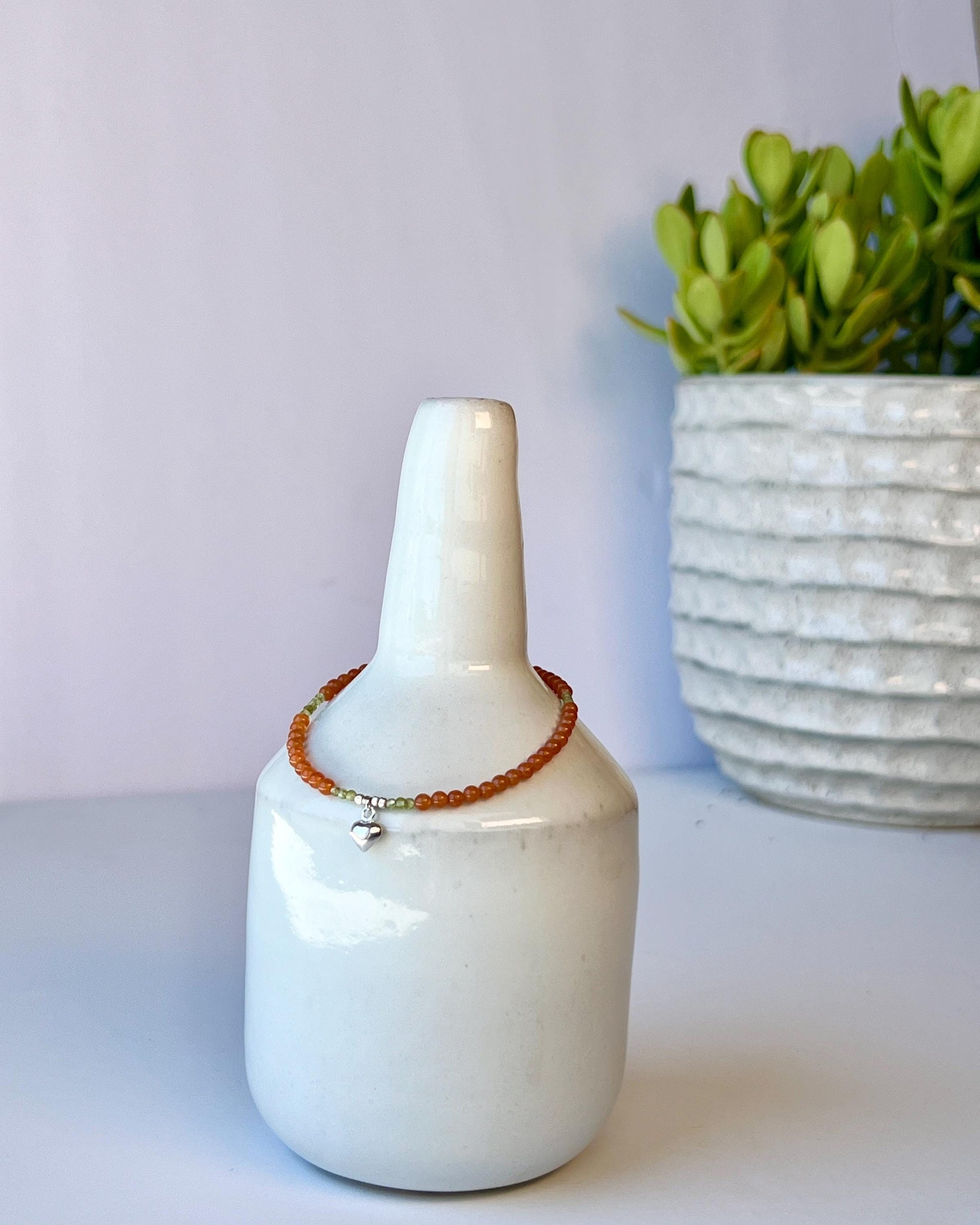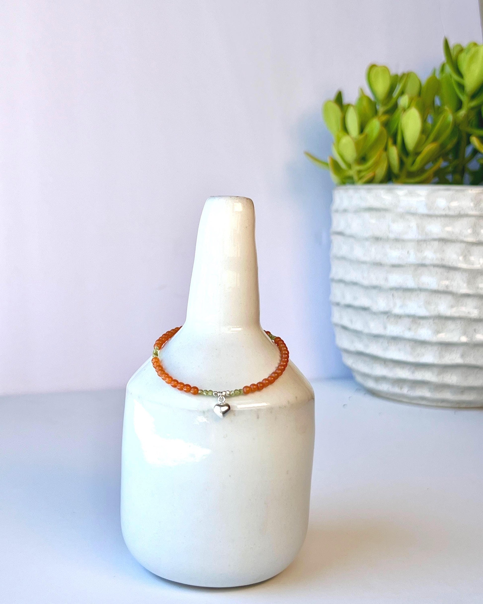 A dainty and minimalist charm bracelet, perfect on its own or layer it with a sterling silver chain for a fun wow factor. Featuring red aventurine and green peridot gemstones, a sterling silver heart charm and tiny sterling silver nugget beads and finished with a sterling silver magnetic clasp. Measures 7-1/4 inches in length.