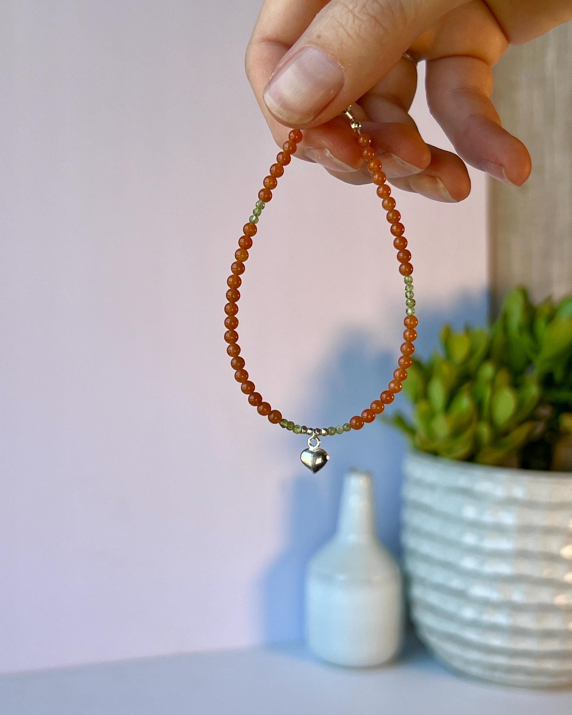 Boho Gemstone Bracelet: Red Aventurine, Green Peridot, Sterling Silver