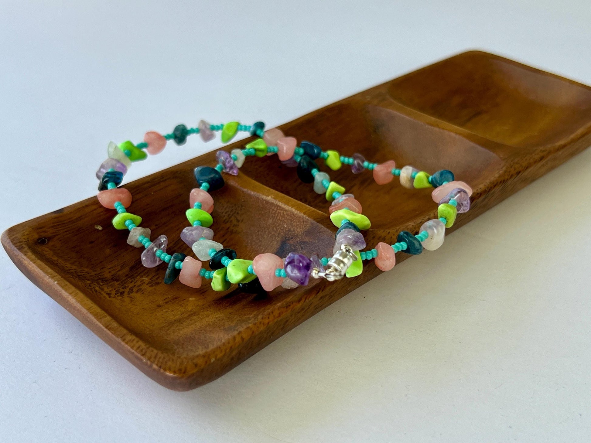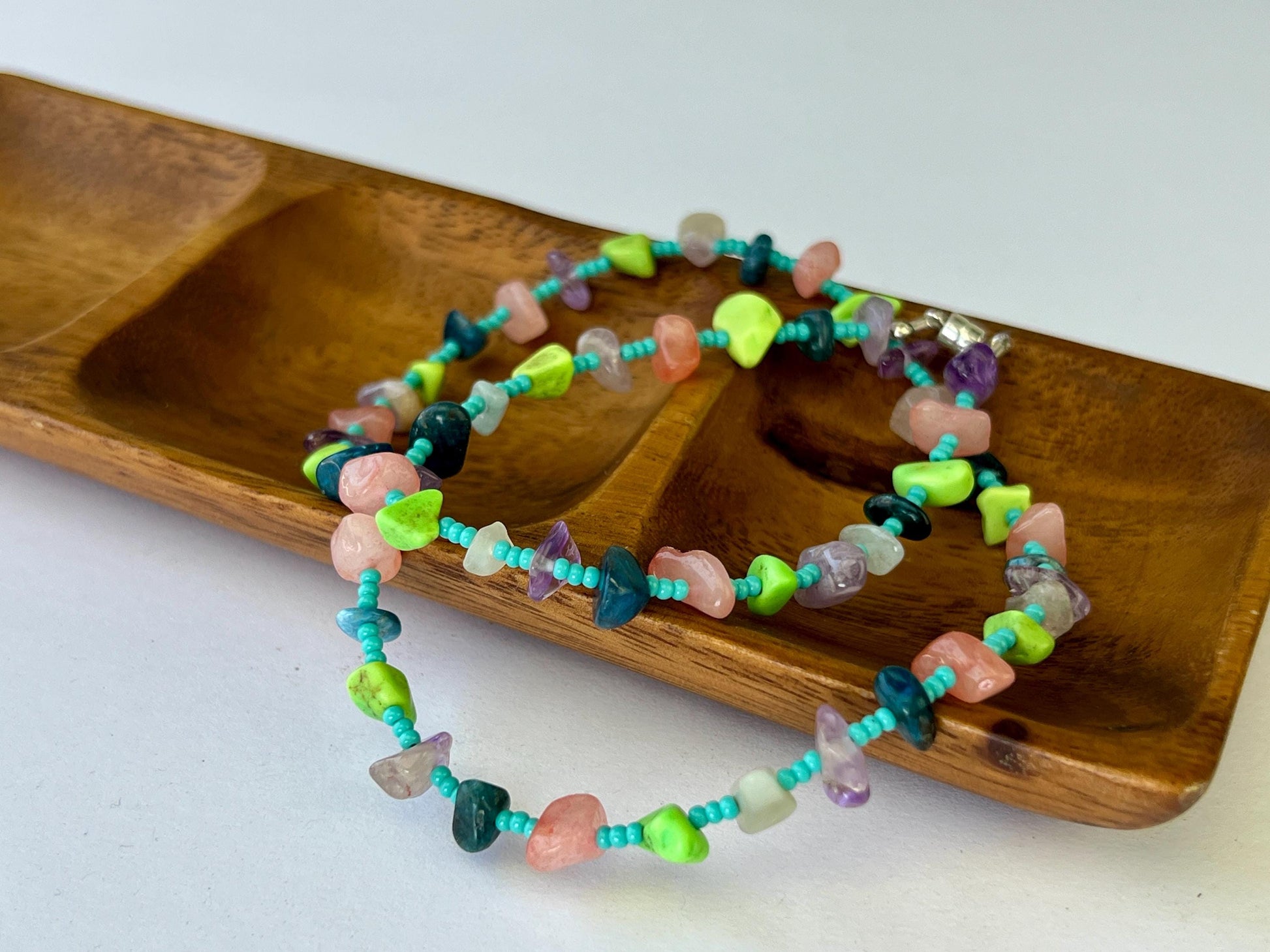 This eclectic boho necklace features a variety of chip stones with small turquoise seed beads strung in between. It measures approximately 18 inches in length and is finished with a sterling silver magnetic clasp.