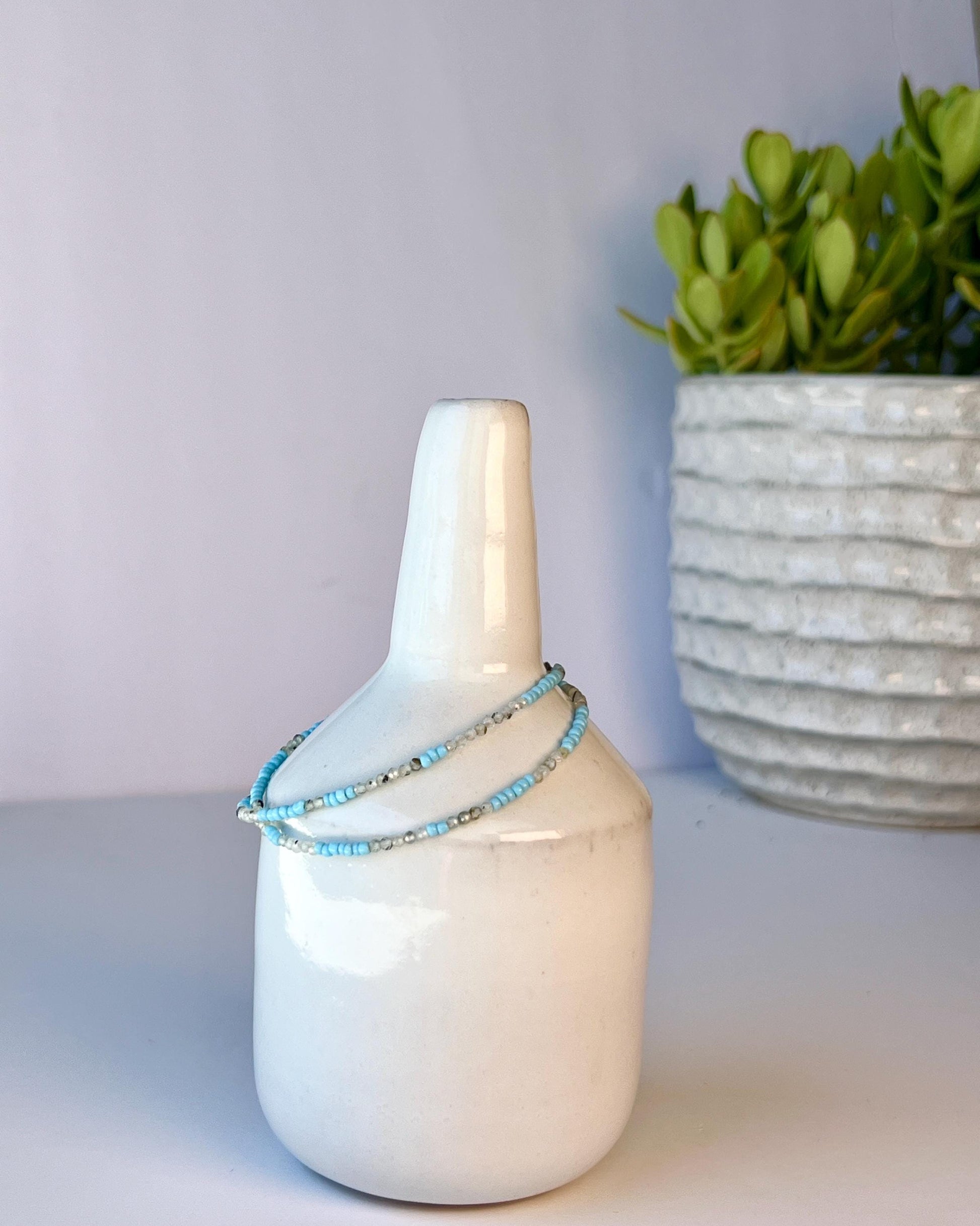 With a fun and unique design, this handcrafted necklace has a blend of 2mm prehnite gemstone and sky-blue seed beads in an alternating asymmetrical pattern with 5 sterling silver nugget beads tucked in off center. Beautiful all on its own, or pair it with one of our sterling silver chains for some extra wow. This minimalist boho style beaded necklace measures approximately 16 inches in length.