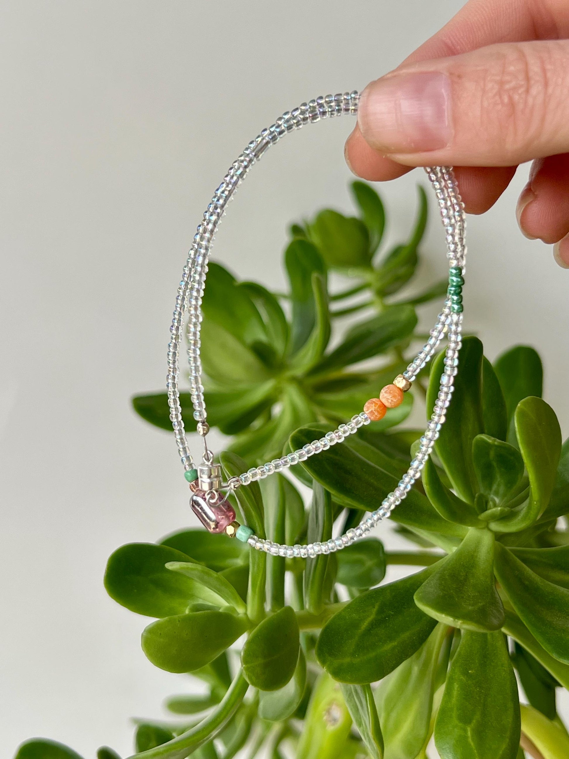 A delicate beaded necklace featuring a minimalist design with tiny silver beads, accented by a central translucent pink bead flanked by small green and gold details. This minimalist boho style beaded necklace measures approximately 16 inches in length.