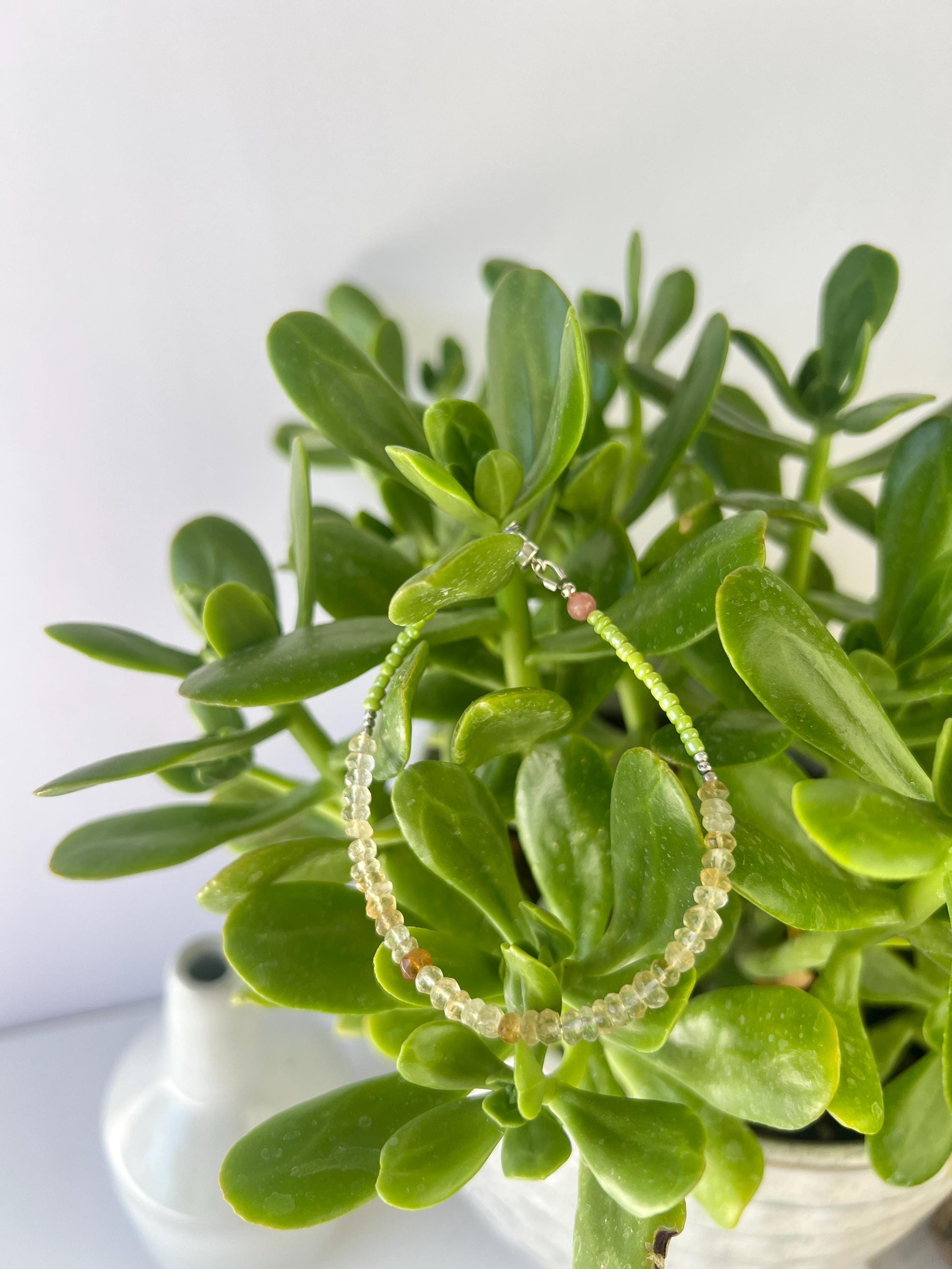 A delightful blend of faceted yellow citrine gemstone beads, luster-finished lime green seed beads, and accented with tiny sterling silver nuggets and rose quartz beads. The bracelet measures approximately 7-1/2 inches in length and is finished with a sterling silver magnetic clasp.