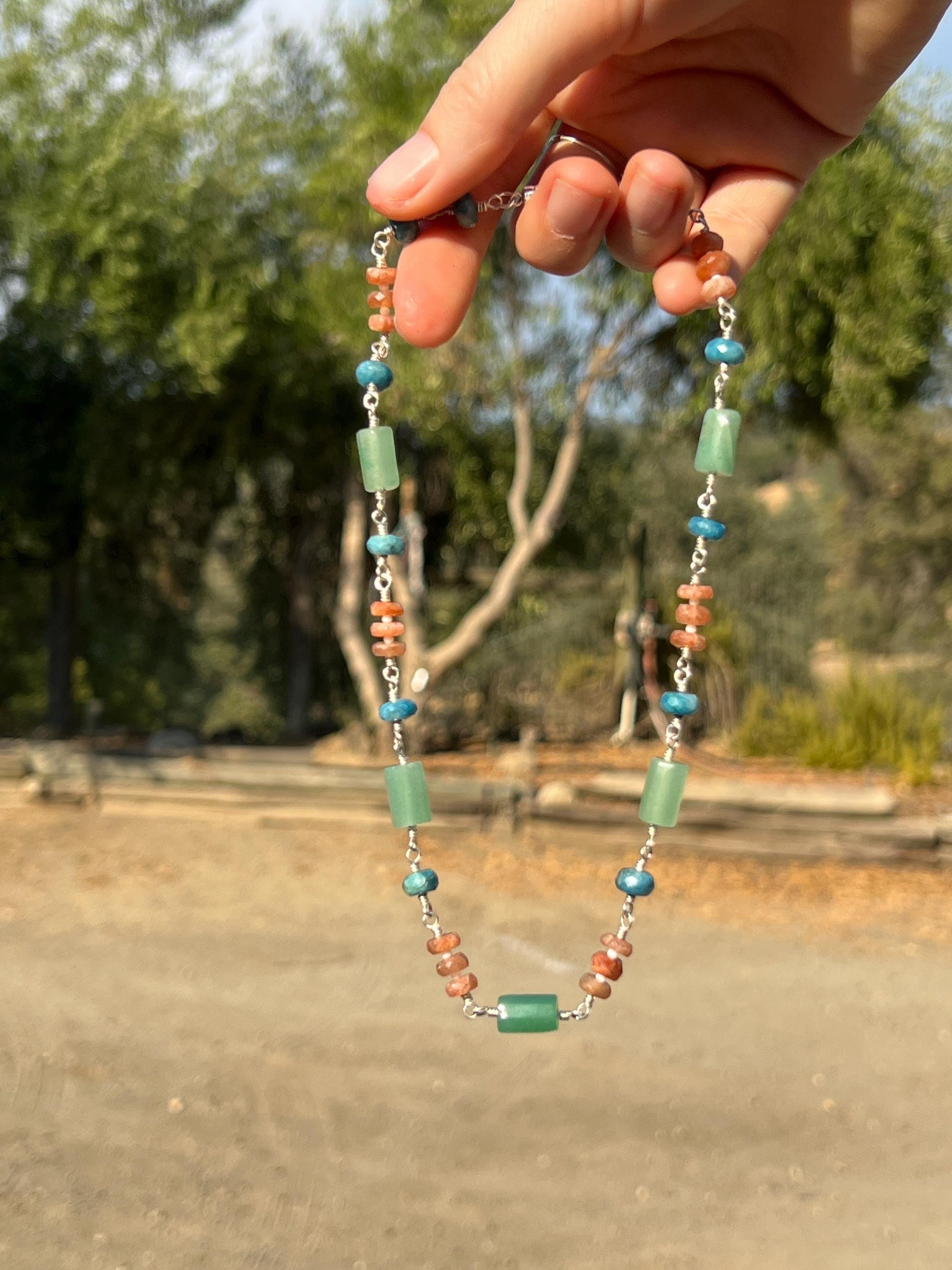 Featuring a thoughtfully curated blend of colorful green aventurine, blue apatite, and orange sunstone (with white seed beads in between) gemstones and hand wrapped 22g sterling silver wire, this boho beauty is sure to be a statement piece to enjoy for many years to come! Finished with a sterling silver magnetic clasp.