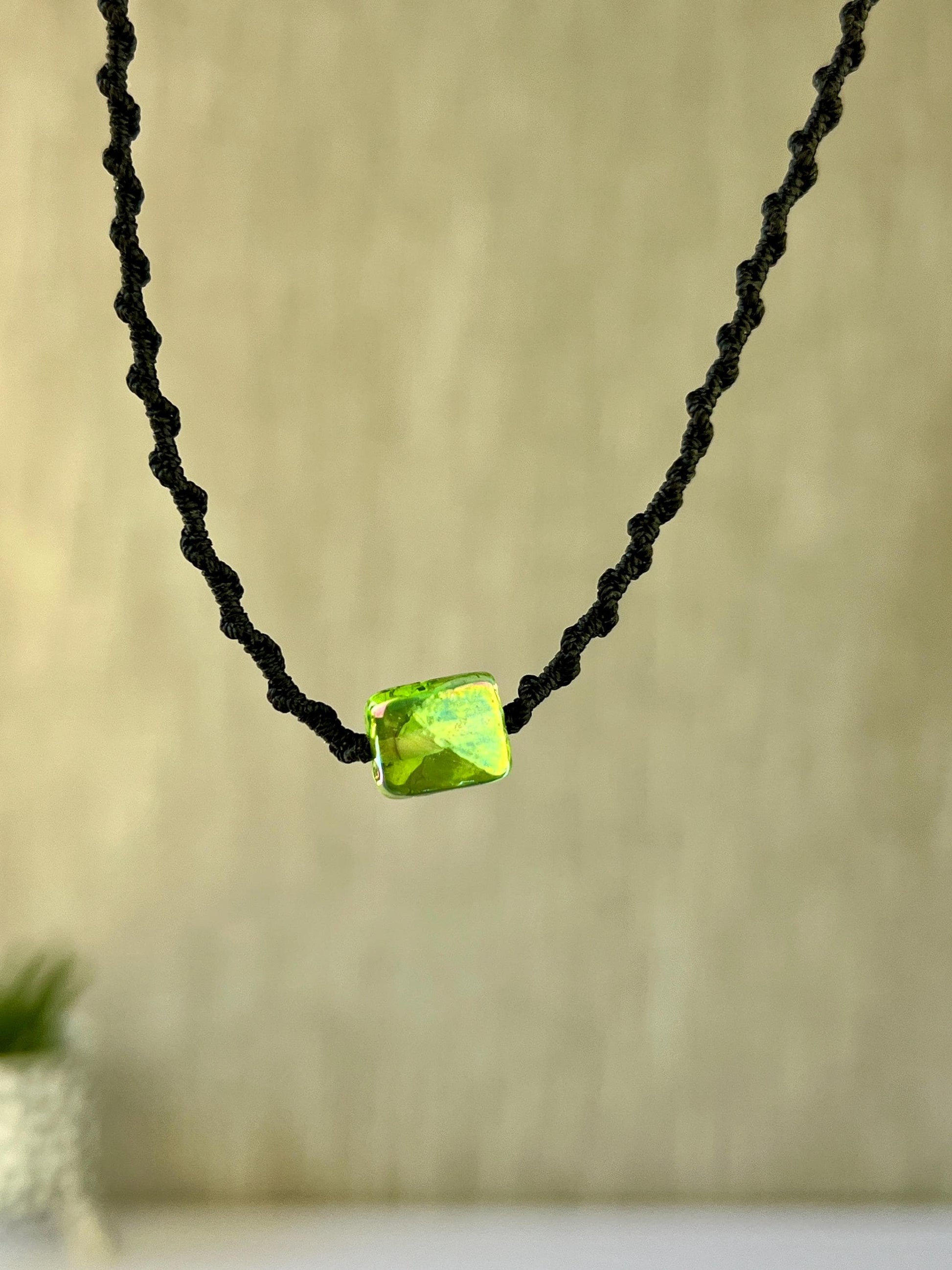 A delicate hand knotted nylon thread necklace featuring a minimalist design with a lime green glass bead and finished with a sterling silver magnetic clasp. This boho style beaded necklace measures approximately 16 inches in length.