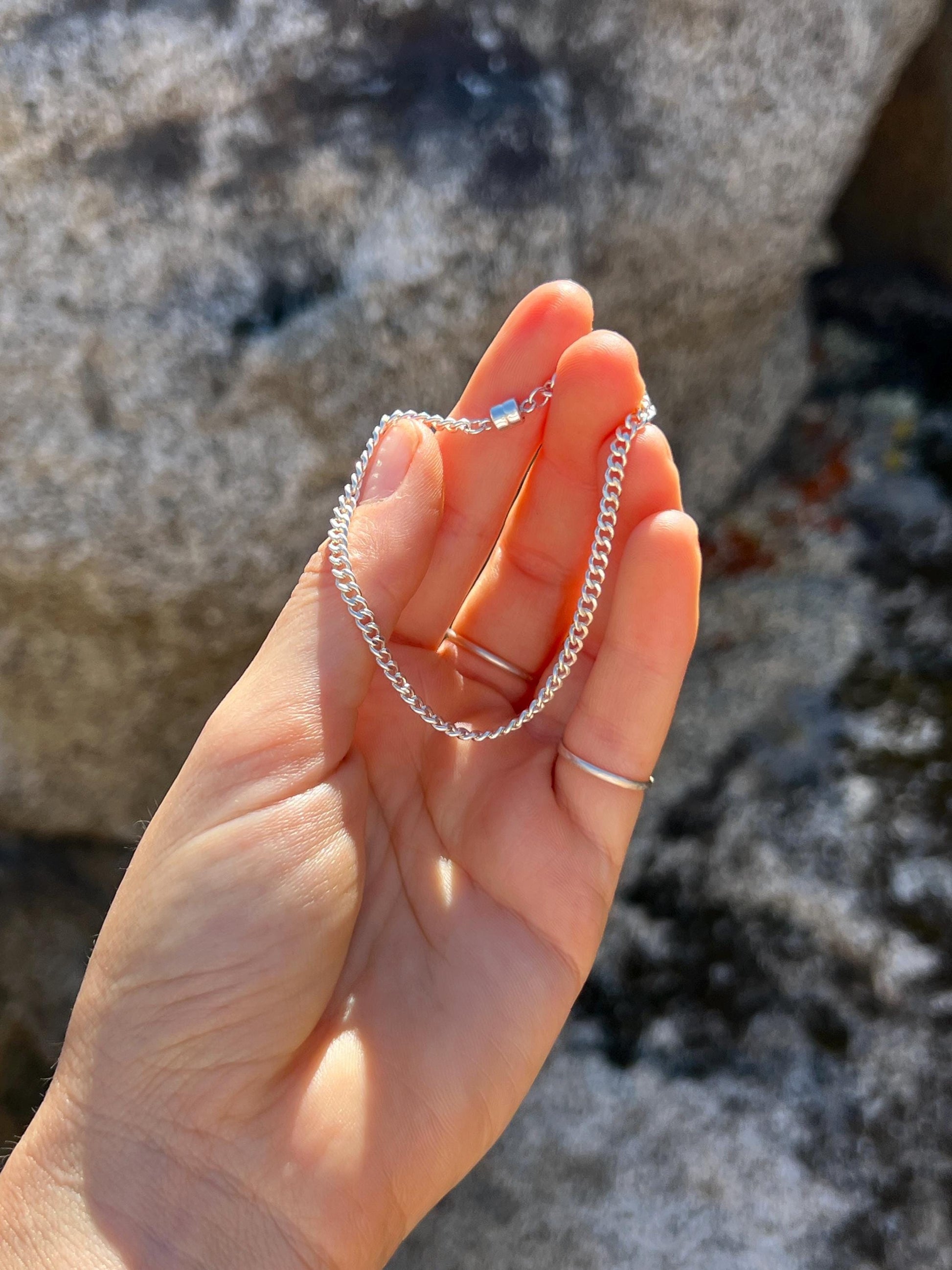 Available in two lengths for that perfect custom fit, this Sterling Silver Cuban Curb Link bracelet is a subtle way to bring a little bling into your everyday style. The 3.15mm chain is lightweight and is finished with a sterling silver magnetic clasp.